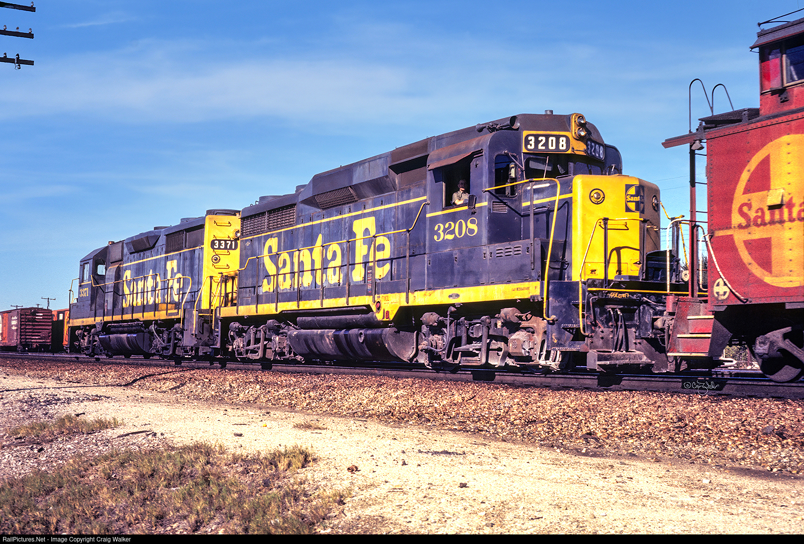 A pair of Santa Fe GPs (GP30 3208 and GP35 3371) work their train at the small yard in Fullerton, just west of the passenger station. ATSF 3208 is the former ATSF 1208, and ATSF 3371 was originally ATSF 1371. (Fullerton, California – January 20, 1973)