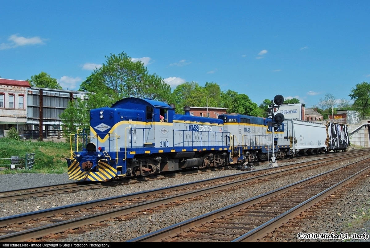 On Cinco de Mayo day in 2010, Mass Central EMD NW5 2100 and GP20 960 are returning from the CSX interchange with two cars in Palmer. The 960 was built for the Milwaukee Road in November of 1954 as a GP9 and is no longer active. The unique NW5 was built in January of 1947 for the Southern Railway. Only 13 were built by Electro-Motive Diesel, and 2100 was the only one rostered by Southern. Sometime after this photo was taken, the locomotive was stored by Mass Central. In late 2021, the locomotive received a fresh coat of paint in Boston & Maine's inspired McGinnis blue and white scheme.