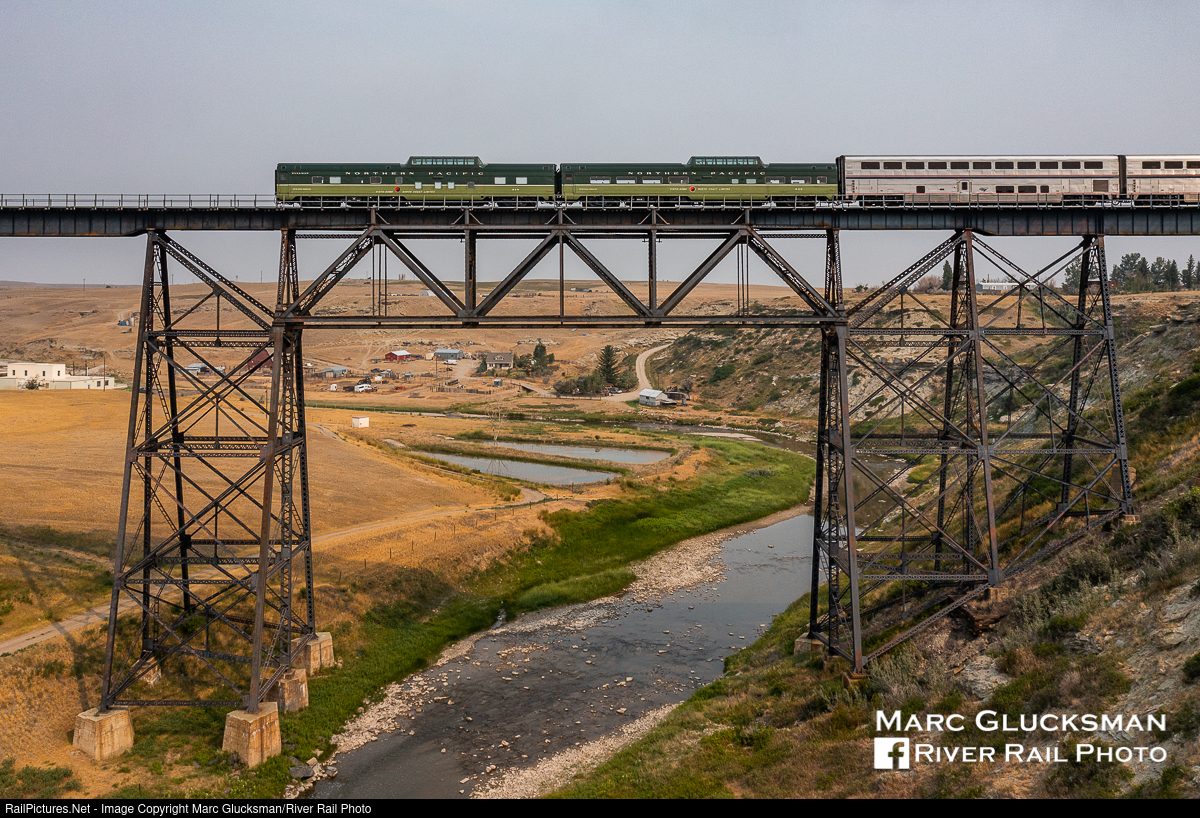 Clear Tops at Cut Bank. Webb Rail's former Northern Pacific Railway Budd built Pullman dome/sleeper 313 (WEBX 801044) and former Northern Pacific Railway Budd built dome/coach 549 (WEBX 801045) held the markers on Amtrak Train 8 (Empire Builder) as it crossed the trestle over the Marias River in Cut Bank, Montana on August 4, 2021. The cars were returning from Portland, Oregon, and would be in Chicago, Illinois the next day.