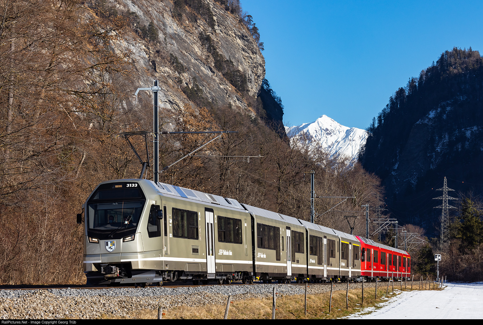 | "Capricorn" ABe 4/16 # 3133 "Piz Palü" in the Champagne paint scheme and # 3125 of the Rhaetian Railway in multiple control are running as Regio Express 1342/1042 from St.Moritz via Zernez-Klosters to Landquart, between Grüsch and Malans. In the background 2412 meter high Chüenihorn near St.Antönien. |
