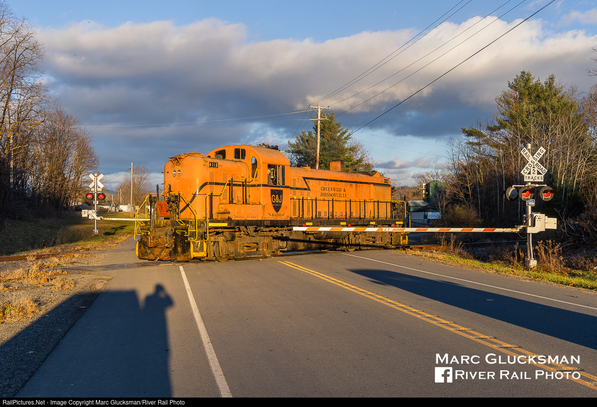 A Really Light Engine. Batten Kill Railroad's 4116 (Also RS-3) was crossing the south leg of the wye over State Route 22 in Salem, New York on the late afternoon of November 23, 2021. With the extremely long shadows of the late autumn sun, the photographer's shadow appears in the photo. A little switching at the Cargill facility in Salem was the order of the afternoon, and just like that 4116 was off to tie down for the night.