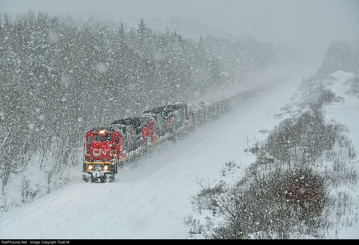 | As heavy large flakes of snow fall quiet is broken on CN's Iron Range sub as first the hum of three dash 8's and then the steel-on-steel whooshing noise of one hundred forty-five ore cars filled with taconite pellets pass by and then it will be quiet again. |