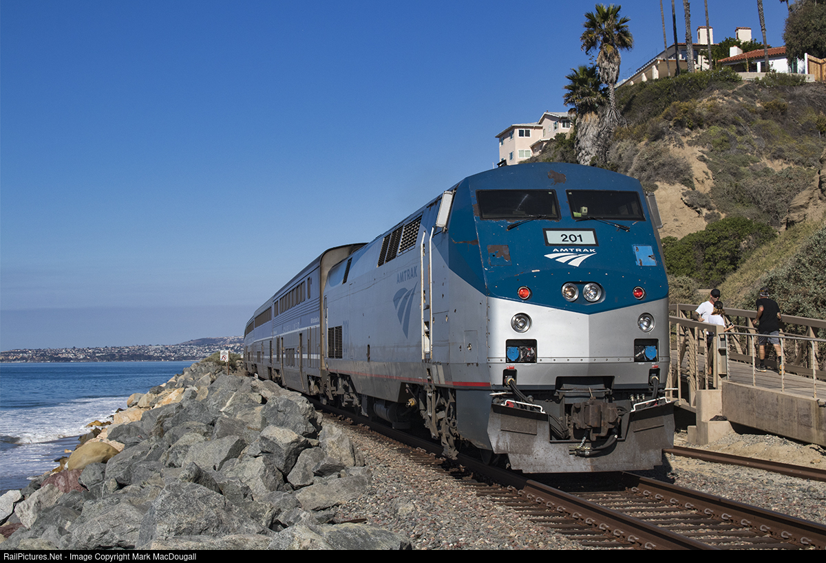 | Amtrak 1767 rounds the bend at San Clemente's North Beach with a P42 on the rear for the trip to LA, where it'll then lead the train to Goleta. |