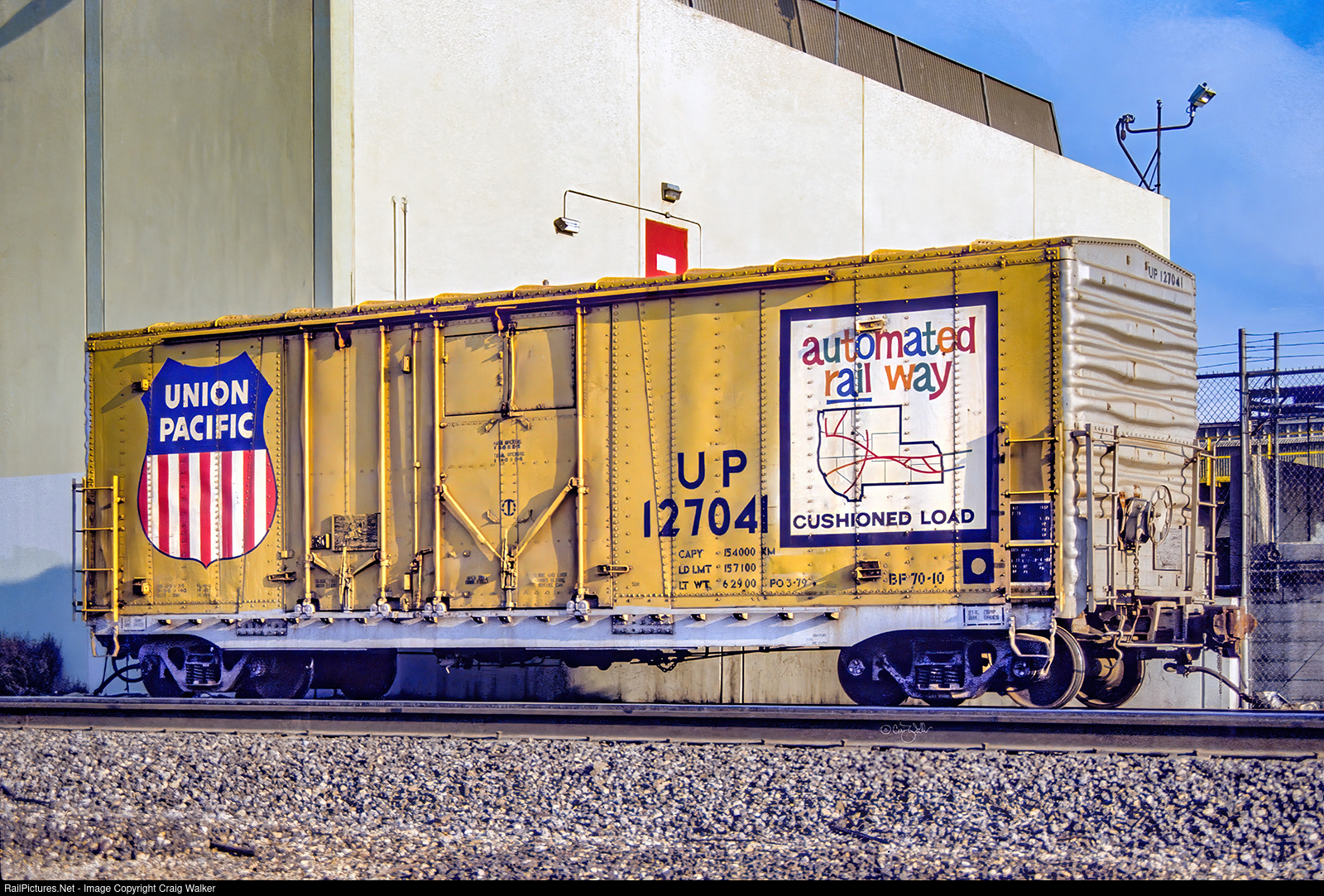 Union Pacific 127041 was classed with the AAR code XM, making it a "plain, unequipped box car." But it isn’t, really, as it is equipped with pair plug doors with a combined width of 14'. And the larger door has openings for grain loading, making this a very versatile car. UP’s class for these cars was BF-70-10, and the UP painted it in their colorful yellow and silver "Automated Rail Way Map" scheme. (Ontario, California – March 27, 1981)