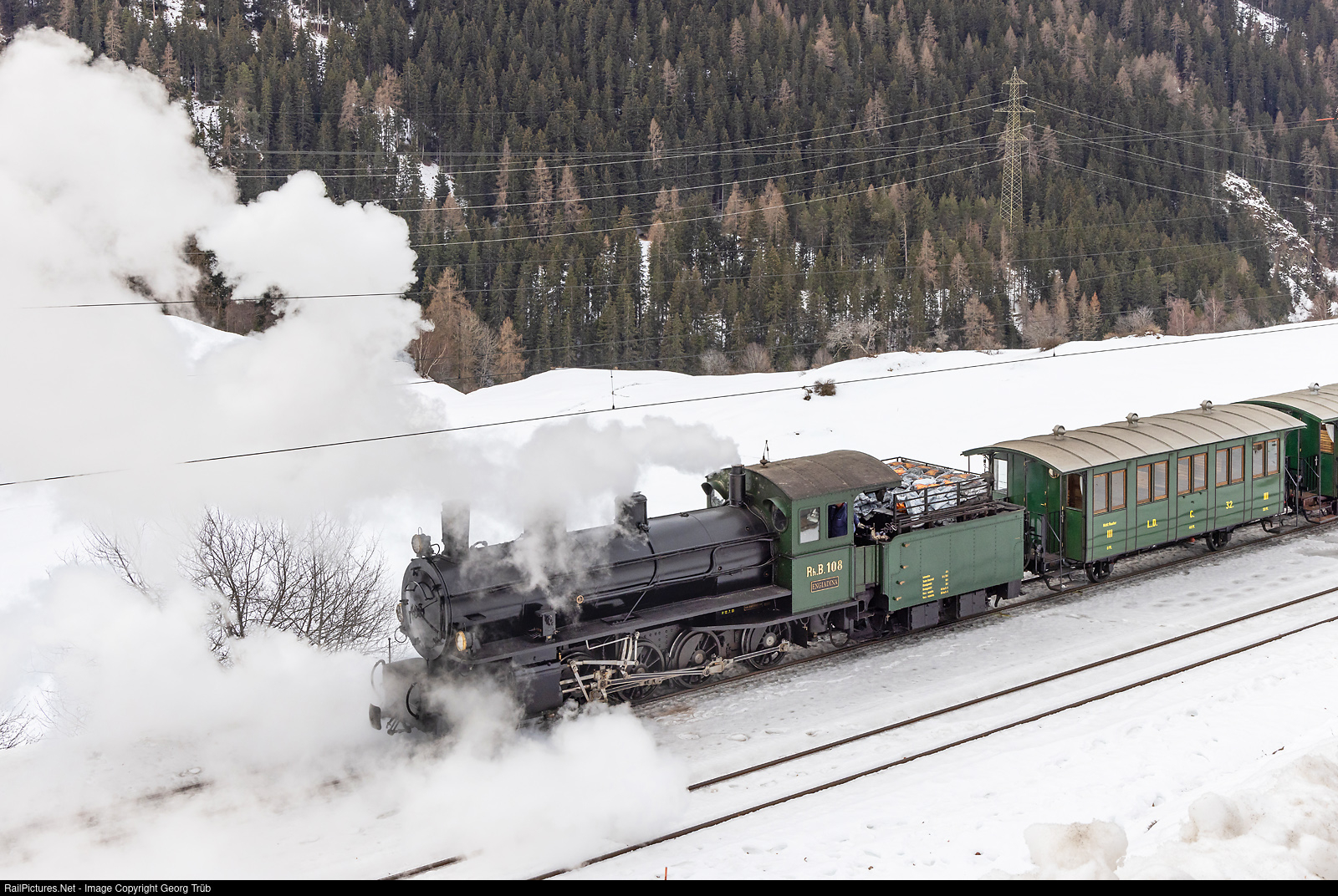 For the training of a fireman, a steamtrain of the Rhaetian Railway ran this day from Samedan to Scuol-Tarasp and back. "Consolidation" 2-8-0 G 4/5 # 108 "Engiadina", built in 1906 by SLM Winterthur, is starting the train in Guarda after a crossing, towards Scuol-Tarasp.