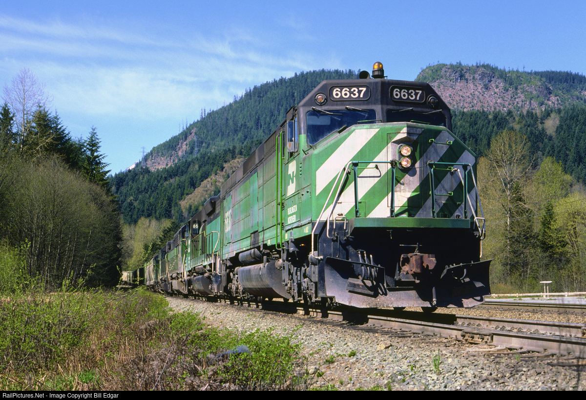 BN F45 no. 6637 heads up an eastbound freight at Skykomish, occupying the siding while a set of helpers are being added to the rear of the train. They will help the train climb Stevens Pass and be set out in Wenatchee, WA.