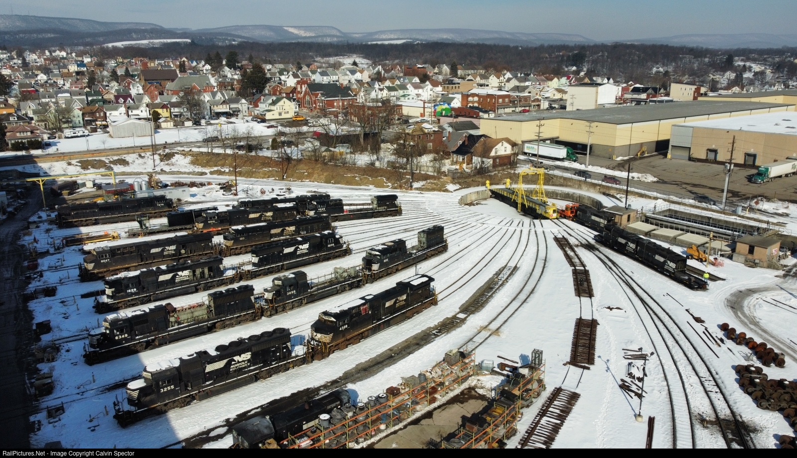 | Norfolk Southern's Juniata Backshops are seen here on a cold winter morning with a large variety of power visible, including a high hood SD40-2 and an SD40E, both now unusual power on NS. |