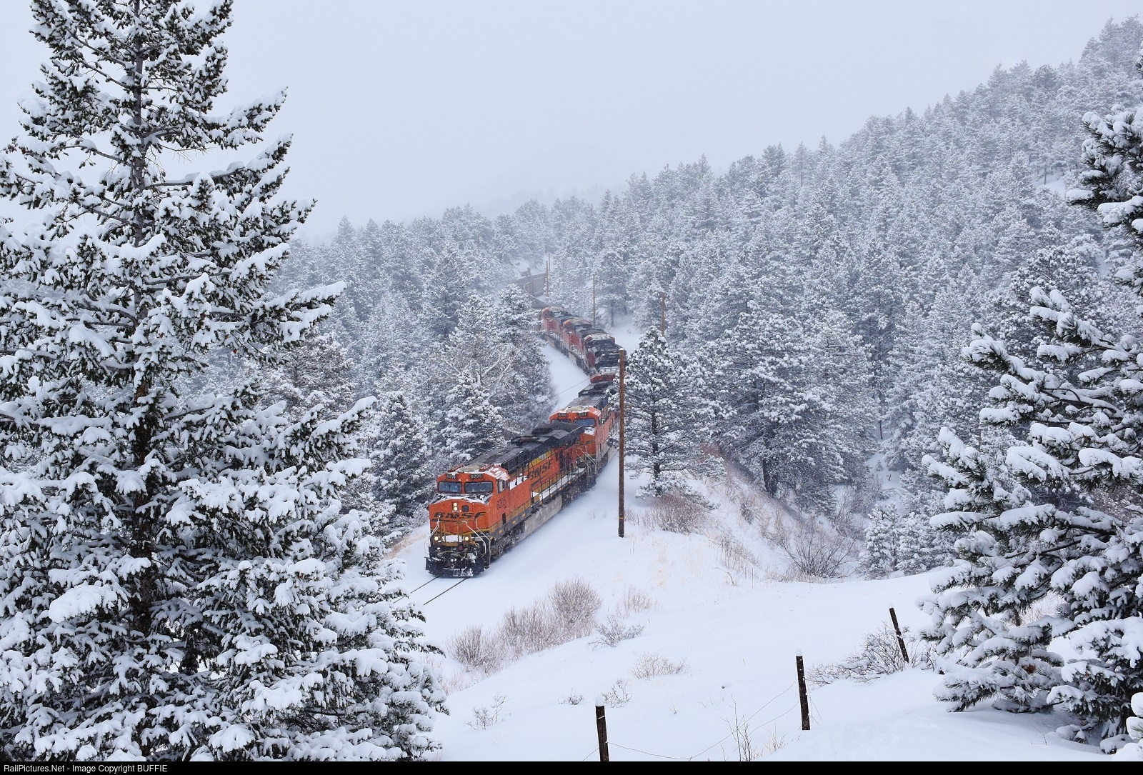 | BNSF 6205 (ES44AC) leads a rare BNSF coal train up the Moffat Tunnel Sub, passing through Crescent, Colorado during a heavy snowstorm.