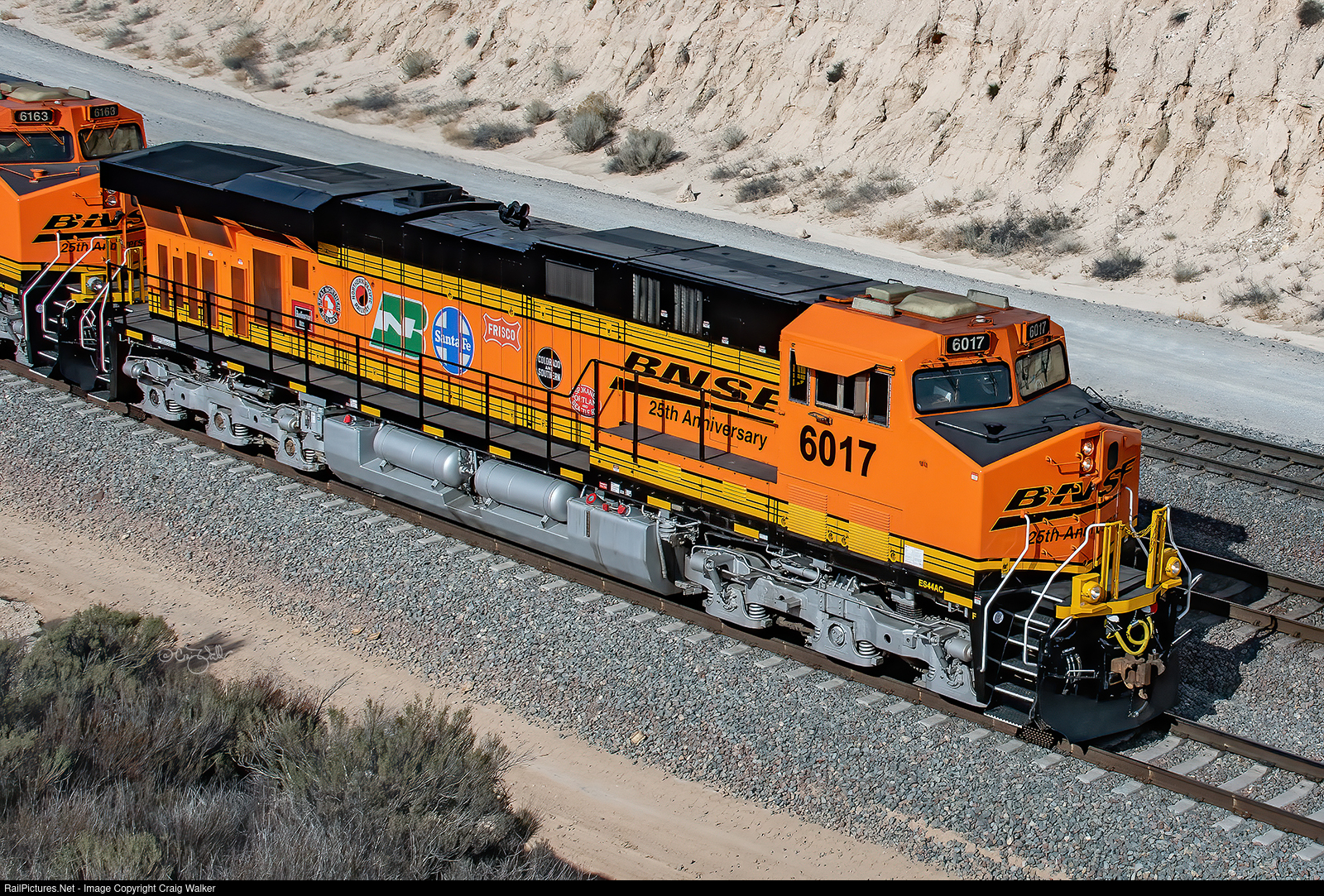BNSF Railway ES44AC 6017 is one of ten locomotives painted in a special scheme to celebrate BNSF's 25th Anniversary, featuring logos from the various railroads that make up the history of the railway. The engine was teamed with another Anniversary engine, 6163, to lead a 13-car Officer Special (BNSF O-THCBAR9-01A) from Thenard, near the ports of Los Angeles and Long Beach, to Barstow. (Cajon Pass, California – February 1, 2022)