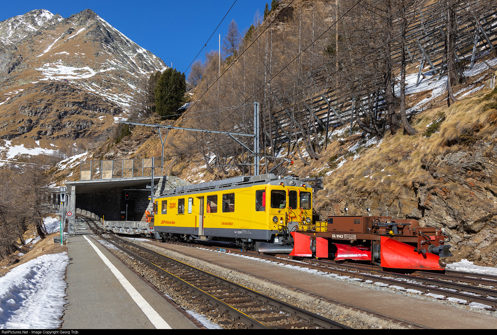 | Railcar of the infrastructure department of the Rhaetian Railway, Xe 4/4 # 23201 with flanger plow Xk # 9143 and a flat car in Alp Grüm, leaving as service train to Ospizio Bernina. Note the extremely few snow for this time of the year! The railcar was built in 1972 as railcar ABe 4/4 # 48 and rebuilt in 2012 to Xe 4/4 # 23201. |