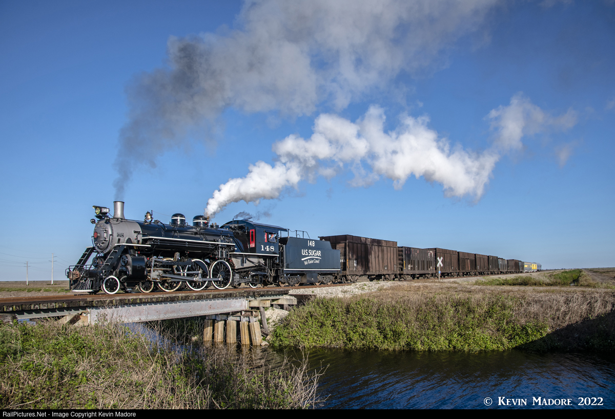 Raising Cane in South Central Florida. On an uncharacteristically chilly morning in late January, US Sugar's pretty Pacific Locomotive #148 charges southbound with a demonstration cane train over the little steel trestle at Rogers Road, about 7 miles southease of Clewiston, Florida. The occasion is a January, 2022 photo shoot for Trains Magazine, celebrating the return of steam power to South Central Florida's cane fields. In a previous life, this locomotive served US Sugar for about a dozen years, working these same cane fields, hauling in the harvest. Re-acquired by the company after nearly half a century, the locomotive has been restored to pristine condition for a new role as a tourist hauler, in which her primary consist will be heavyweight passenger cars. But occasionally, the company has and will continue to use her in a public relations role, hauling special holiday trains, and even some actual cane traffic, in cars just like the ones seen here.