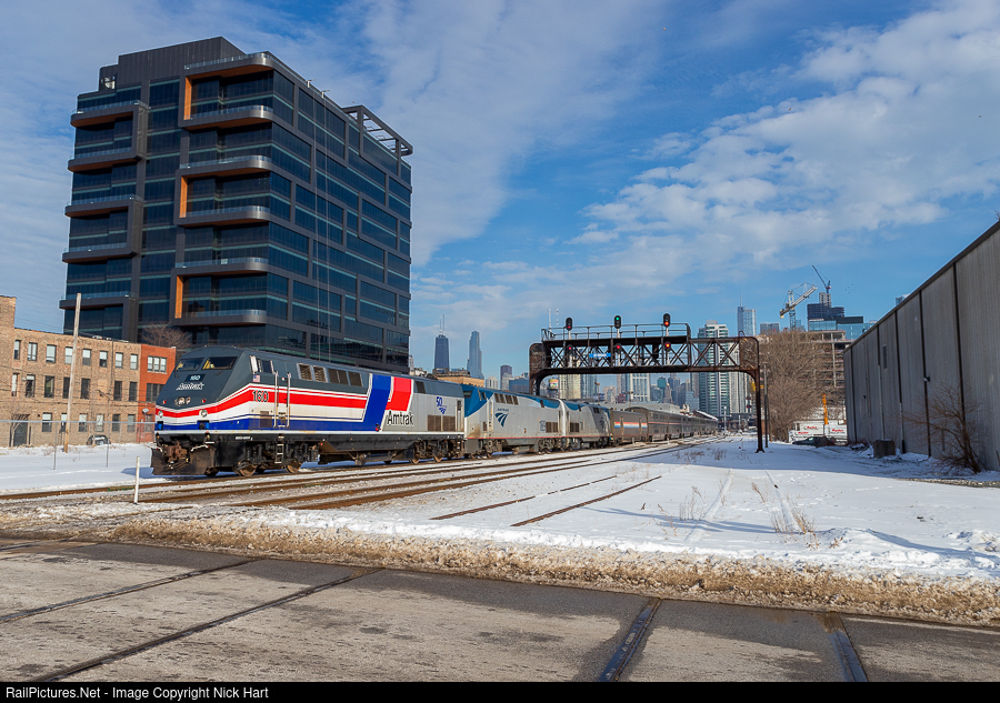| CP Morgan was the place to be this afternoon as more than a dozen photographers gathered for Empire Builder train #7's departure out of the windy city. The heritage "Pepsi can" P42 looks great on the point as it passes under the old Pennsy signal bridge at Racine Avenue. |