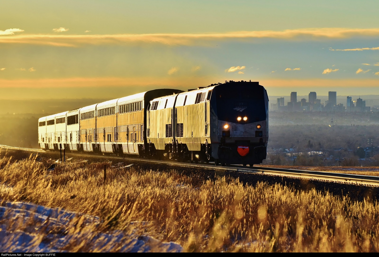 Amtrak engine 27 (P42DC) leads the Winter Park Express Ski Train from Denver as a golden sunrise greets the crew and passengers.