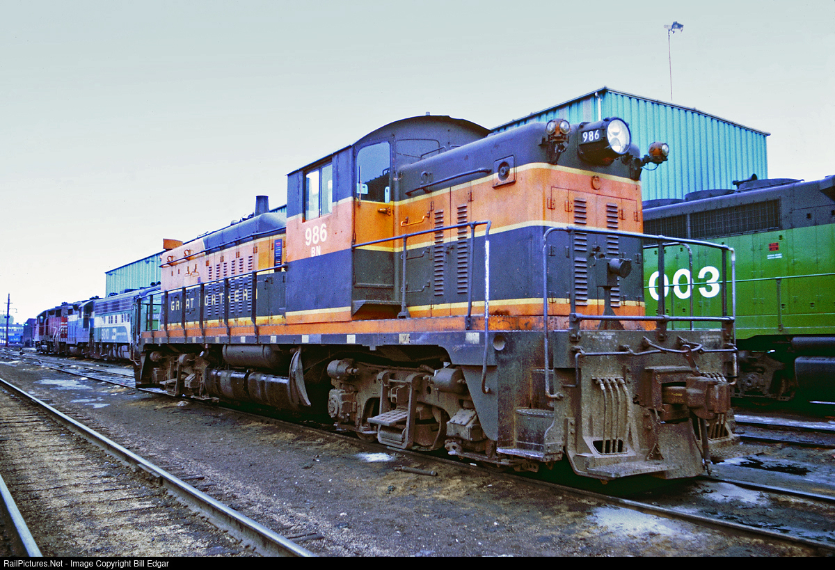 | BN 986, a former GN NW5 added to the color at Harrison in early January 1973. This 1000 HP road switcher was a rare bird with only a dozen or so being produced, most for GN. They were on early attempt (WWII era) to compete with Alco RS1s and road on an F unit length frame using Blomberg road trucks. Under the hood they were essentially a 1000 HP NW2. A boiler would fit in the short hood. |
