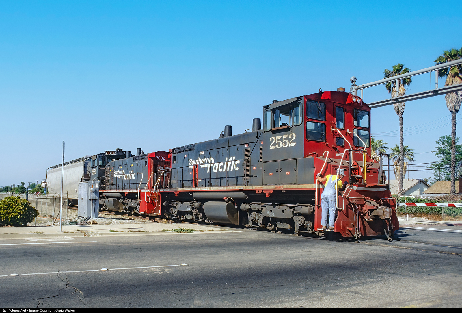 Southern Pacific SW1500s 2552 and 2632, now owned by Union Pacific, work the UP’s Huntington Beach Local. These two "Cruds" have cut a Centerflow covered hopper off their train to spot at an industry in Stanton, about halfway between Anaheim and the end of the line in northern Huntington Beach. Both of these engines are wearing the last paint scheme used by the SP, which shows the influence of the Denver & Rio Grande Western Railroad, which purchased the SP in 1988. (Stanton, California – April 10, 1997)