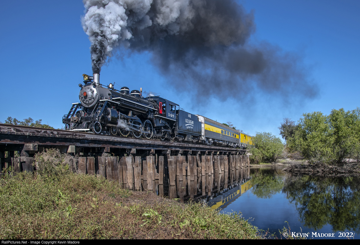 Southbound over Fisheating Creek. Less than a mile south of the little town of Palmdale, Florida, US Sugar's ALCO Pacific charges southbound across the timber trestle at Fisheating Creek, headed for Moore Haven, and her next water stop. On this second day of the 2022 Trains Magazine Charter, the 148 is hauling a passenger train consisting of a dining car, open-air baggage express and the private car "Georgia." Ultimately, US Sugar plans to have a complete train set, including several coaches, which will match the dinning car you see right behind the locomotive in this photo. The open-air baggage express will serve as an observation car, and the Georgia, which is leased, will typically be used only on special trains. On this photo charter, the Georgia came along because she has multiple restrooms, whereas the other cars currently do not. Needless to say, it was quite a privilege for most of the photographers to get a chance to ride on this car, which has been used in three Presidential campaigns over the past 20 years.