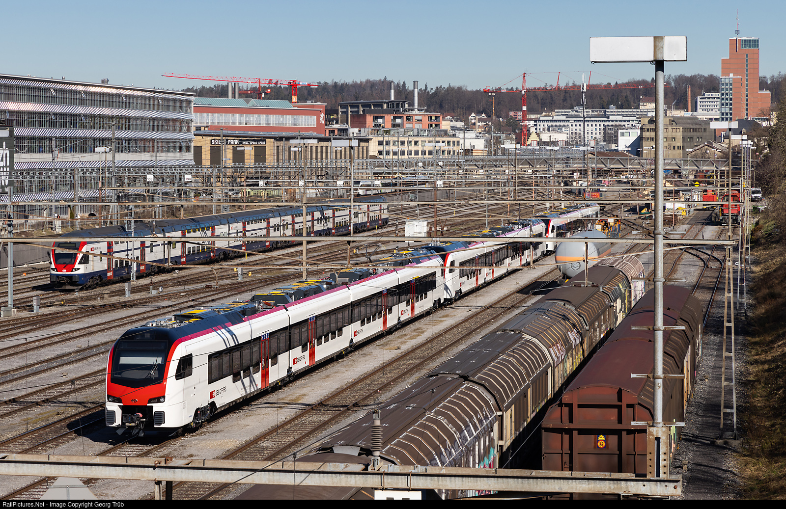 | Brand new Flirt "Mouette" (Seagall) RABe 523 # 502, # 503 and # 501 for the SBB in Winterthur freight yard, for tests by StadlerRail. |