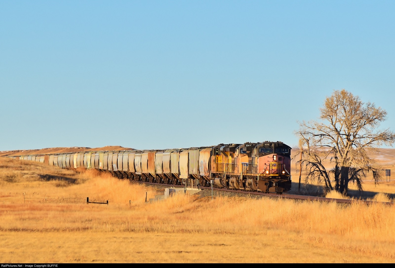 UP 8318 in Southern Pacific paint runs a grain train on the old Kansas Pacific line at Cedar Point, Colorado.