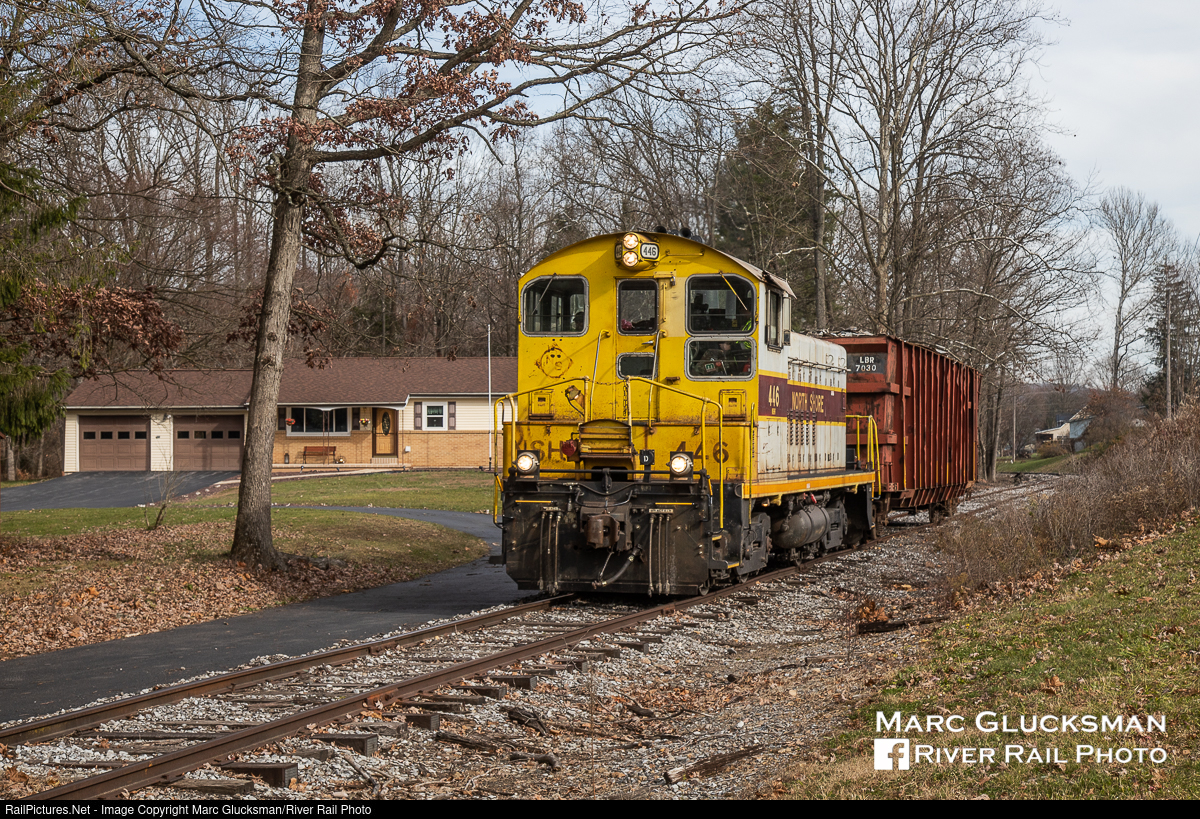 Front Yard Railroading. This residence in Lewistown, Pennsylvania may have to occasionally wait to leave the driveway, but where the lawn ends, a prime view of the railroad begins! On November 19, 2020, Juniata Valley/North Shore Railroad 446 (ex-CR 8983, née NYC 8983, EMD SW9, 1/1953) has an unusually easy day bringing a single loaded car of scrap back to its interchange with Norfolk Southern.