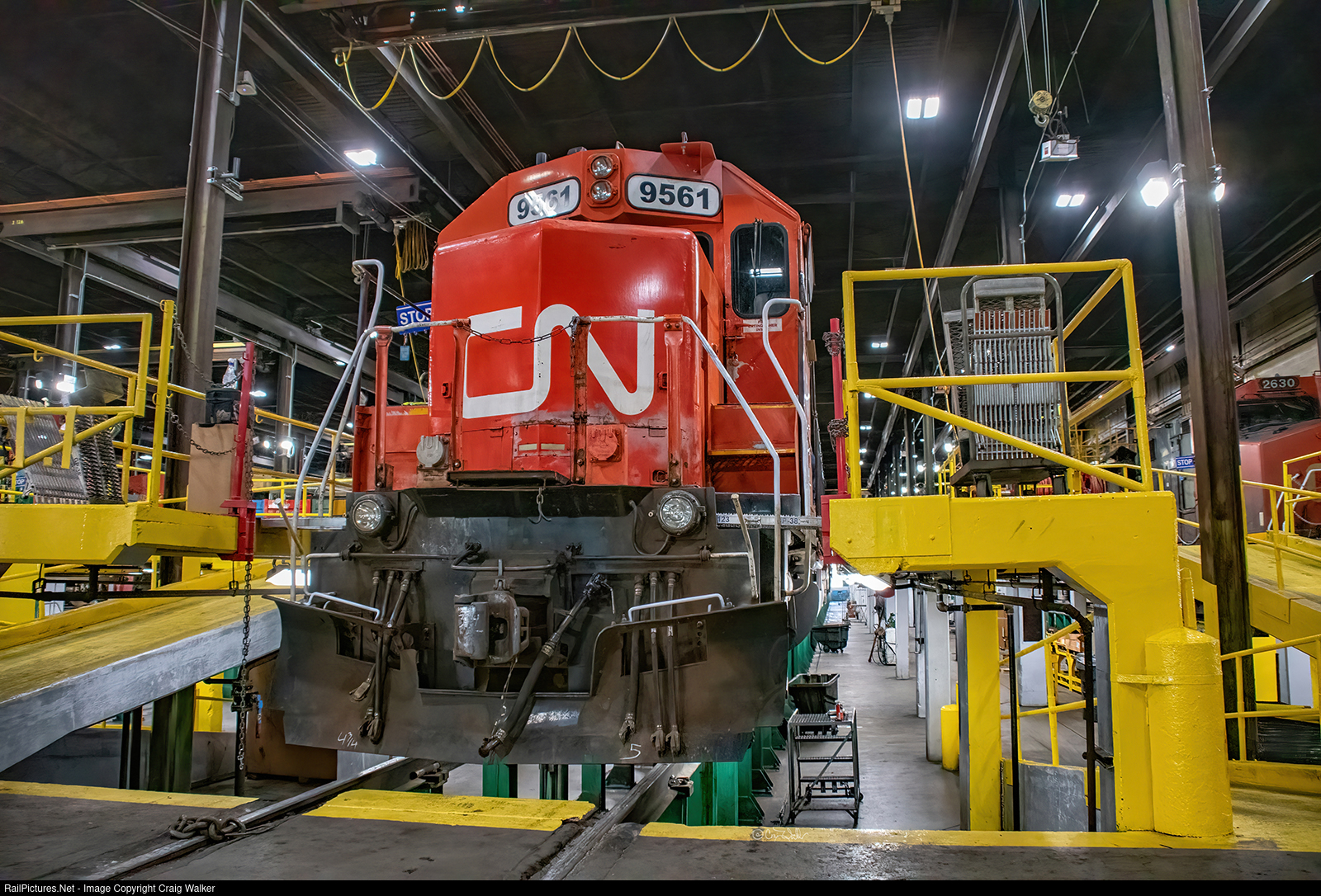Tucked inside the Canadian National’s Woodcrest Locomotive Shop and receiving some care is Illinois Central GP38-2 9561. Built by EMD in April 1972, this engine was originally Gulf Mobile & Ohio 741, and then became Illinois Central Gulf 9561. (Homewood, Illinois – September 26, 2021). Photgraphed on railroad property with permission, full PPE and Covid protection.