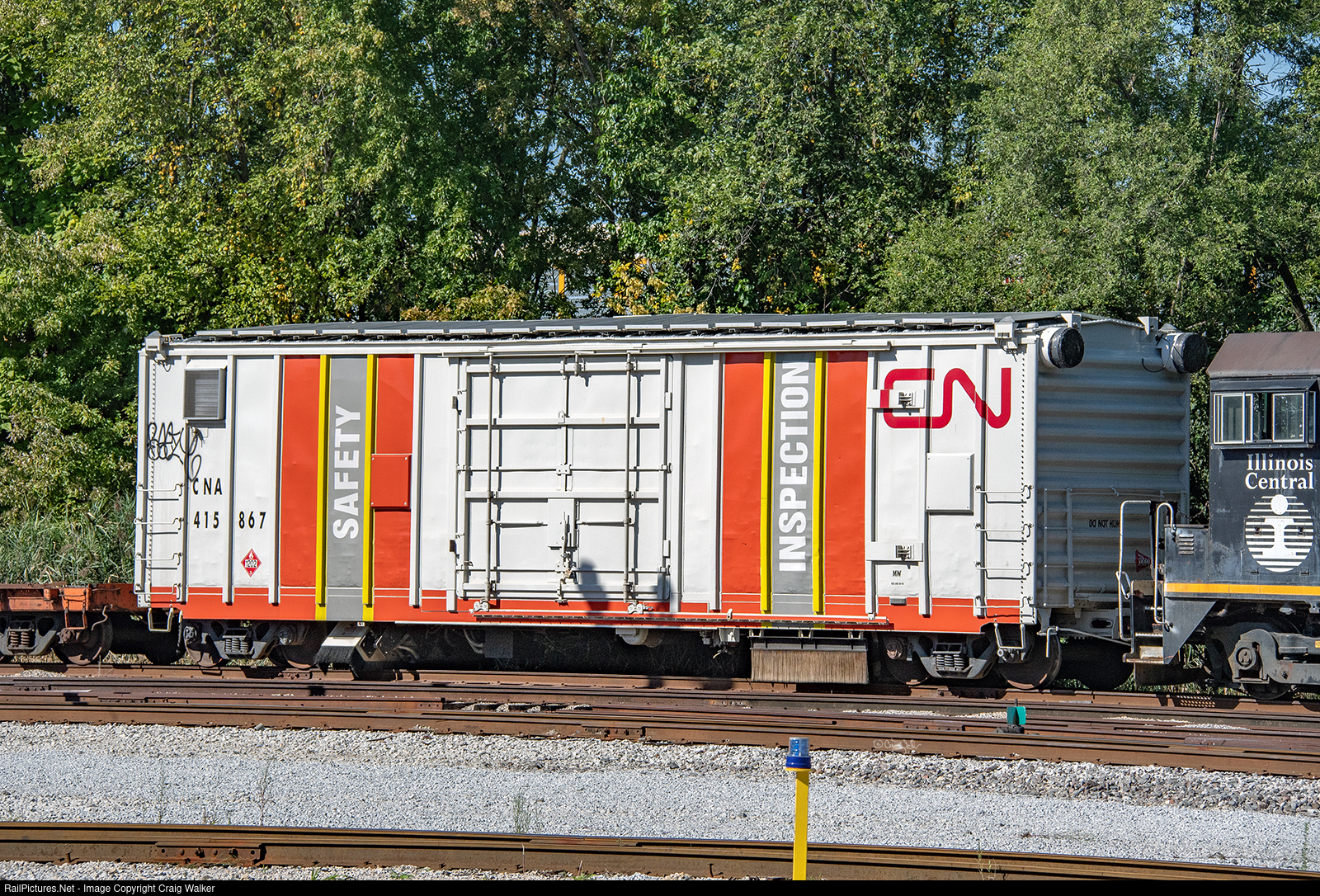 An interesting Safety Inspection Car was spotted in Canadian National's Woodcrest Shops. This car appears to be similar to the Tetra Tech RailAI autonomous track assessment car (TETX 001), for which more information can be found at https://railai.tetratech.com/ (you'll have to cut-and-paste that address into your browser, as it is not a link in this caption). Note the measuring equipment underneath the car, and the solar panels on the car's roof. (Homewood, Illinois – September 26, 2021). Photgraphed on railroad property with permission, full PPE and Covid protection.