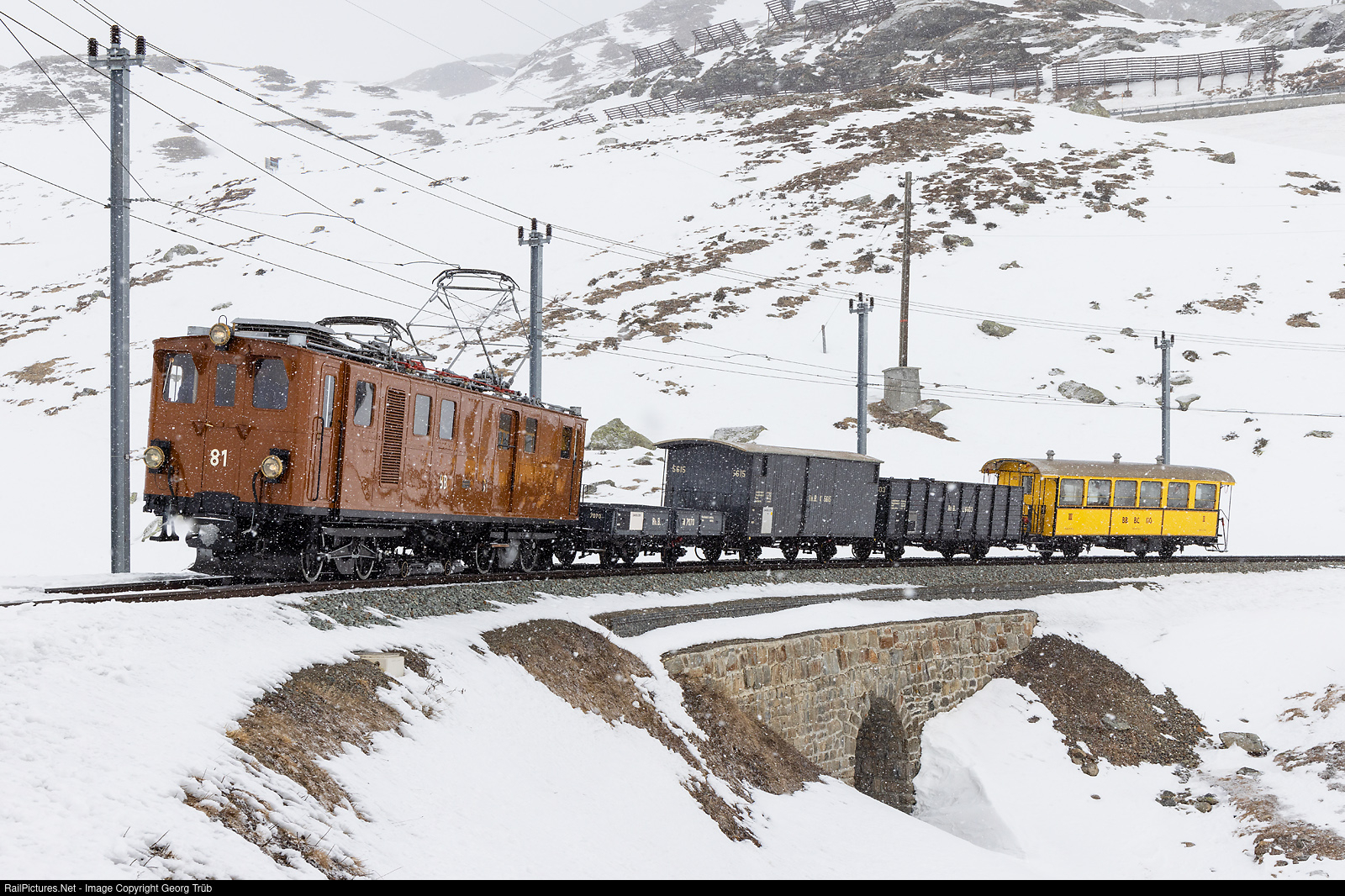 In harsh winter conditions the former Bernina Railway locomotive Ge 4/4 # 81 is pulling a mixed freight/passenger train through the "Jochum curve" in the Bügliet valley on the shore of the Lago Bianco on about 2250 meter a.s.l. The "BB 81" of 1916 is now with the Blonay-Chamby Railroad Museum and guest on the old home rails for about one year. This was a photo charter organised by R.M.