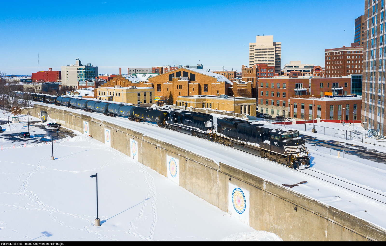 | A pair of former NS units power the New York, Susquehanna & Western's CL-1 job as it gets on the move south out of Syracuse, New York after swapping trains with CSX at the interchange. The train is passing through Armory Square on a section of elevated trackage through downtown. |