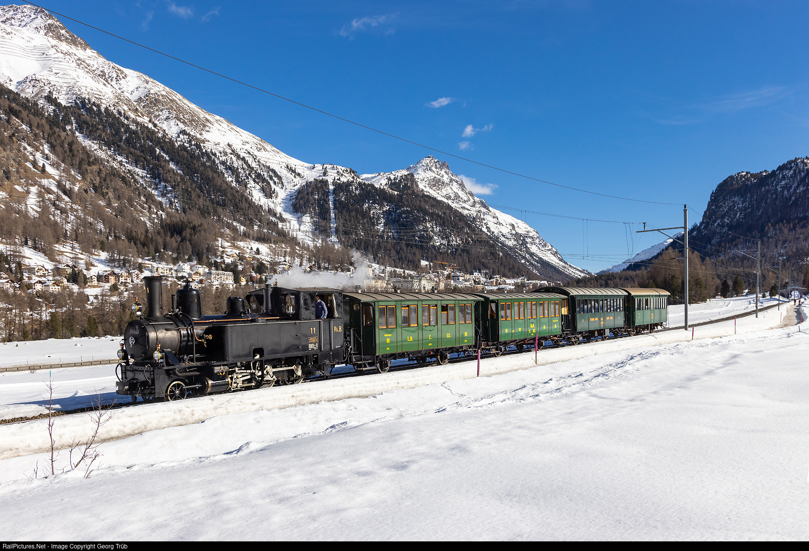 For the second time this winter, so-called "triangular trips" with the steam locomotive G 3/4 # 11 "Heidi" took place in the Upper Engadine, between St.Moritz, Pontresina and S-chanf. The light oil fired 2-6-0 T "Mogul" G 3/4 # 11 "Heidi" of the Rhaetian Railway, built in 1902 by SLM Winterthur, is pulling train 2950 from Pontresina to S-chanf, between Pontresina and Punt Muragl. The cars are third class C # 32 former Landquart-Davos Bahn (LD) (built 1889), third class C # 66 (built 1897), Bistro car "Filisurer-Stübli" B # 2138 (built 1903) and first class A # 1102 (built 1903).