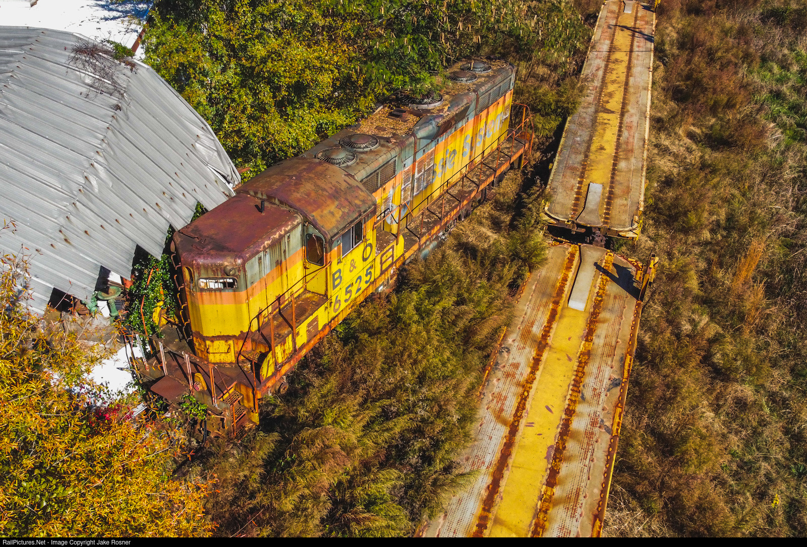 HRT 6525, a rail veteran for the B&O railroad, remains stationary beneath overgrown trees behind a pottery shop, in very rough shape.