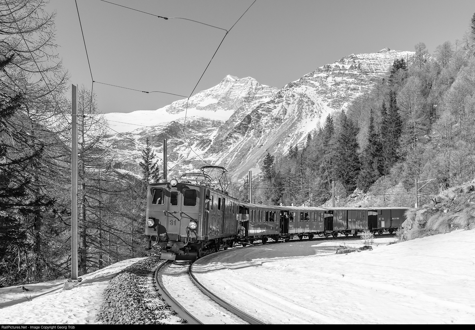 Ge 4/4 # 81 (or BB # 81) of the Blonay-Chamby Railroad Museum, built in 1916 for the Bernina Railway as Ge 2x3/3 # 81, as guest on the former home rails, is pulling the "Bernina Winterzauber" train from St.Moritz to Alp Grüm (-Stablini), around the 180 degree horseshoe curve in Stablini with a radius of 45 meter only, with the east peak of the Piz Palü (3883 meter a.s.l.) and Piz Caral (3429 m) in the background. The cars are third class C # 32 and C # 66, baggage F # 4 and covered freight car K # 5342, all rebuilt by Club 1889. The photo is a free interpretation of a very well known about 90 years old black and white picture (photo Albert Steiner, St.Moritz), with the same locomotive at the same place with the view to Piz Palü. When the "BB 81" ran through this curve on february 13th, 2022, this was the very first time since about 1964 (unassisted).