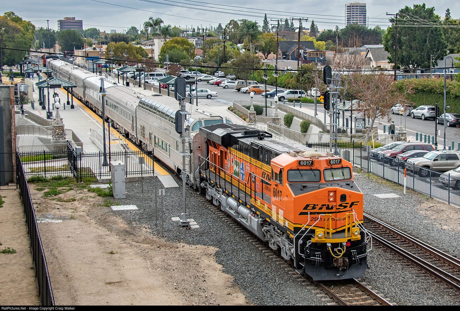 BNSF Railway sent an empty Business Car Train from Los Angeles to San Diego, and the train, symbolled O-LACSDG1-21A, is seen passing through a Metrolink station on Metrolink’s Orange Sub. BNSF ES44AC 5828 is leading the train, which consists of power car 51 Mt Rainier, business car 63 Glorieta Pass, business car 6 Topeka, sleeping car 67 Trinchera Pass, business car 4 Missouri River, dining car 10 Lake Superior and full-length dome/lounge 31 Carl R Ice, with BNSF ES44AC 6017 on the rear, as tomorrow’s train will operated from San Diego to Oceanside and return, and will not be able to be turned. Both engines wear the BNSF’s 25th Anniversary scheme. (Orange, California – February 21, 2022)