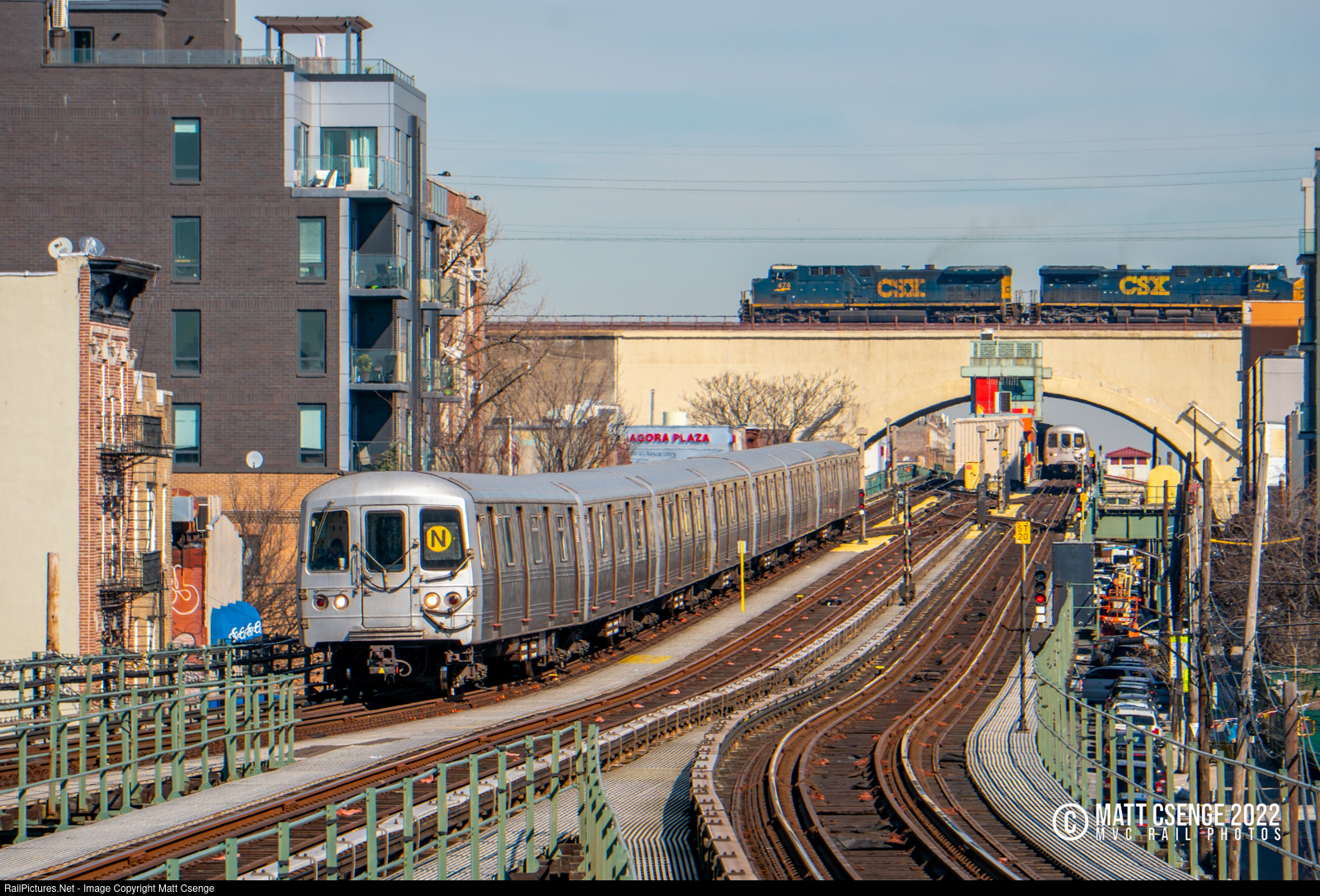 A Manhattan-bound N train has just departed Astoria-Ditmars Blvd station while the near daily CSX Fresh Pond to Oak Point transfer rumbles up the Hell Gate Bridge overhead.