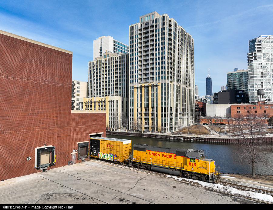 | With GP38-2 #815 in charge, UP local YPR60B shoves its one boxcar into the Chicago Tribune, right next to the Chicago River. The conductor and a few UP maintainers spent about a half hour dealing with a frozen switch. The 100-story John Hancock Center is visible through the skyscrapers of downtown Chicago. |
