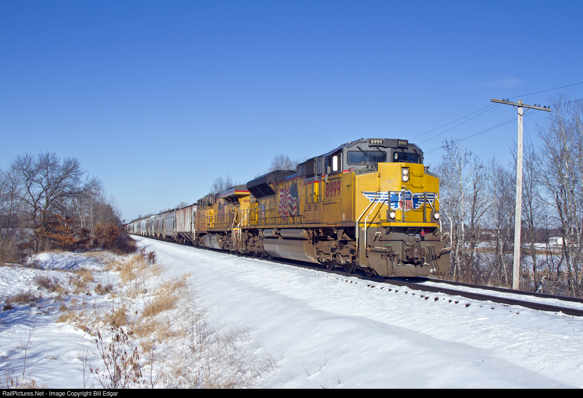 | UP 8999 leads a 15000 ft. land barge east at Bramar Rd. south of Fairchild, WI. The train was running between Altoona and Adams, WI. |