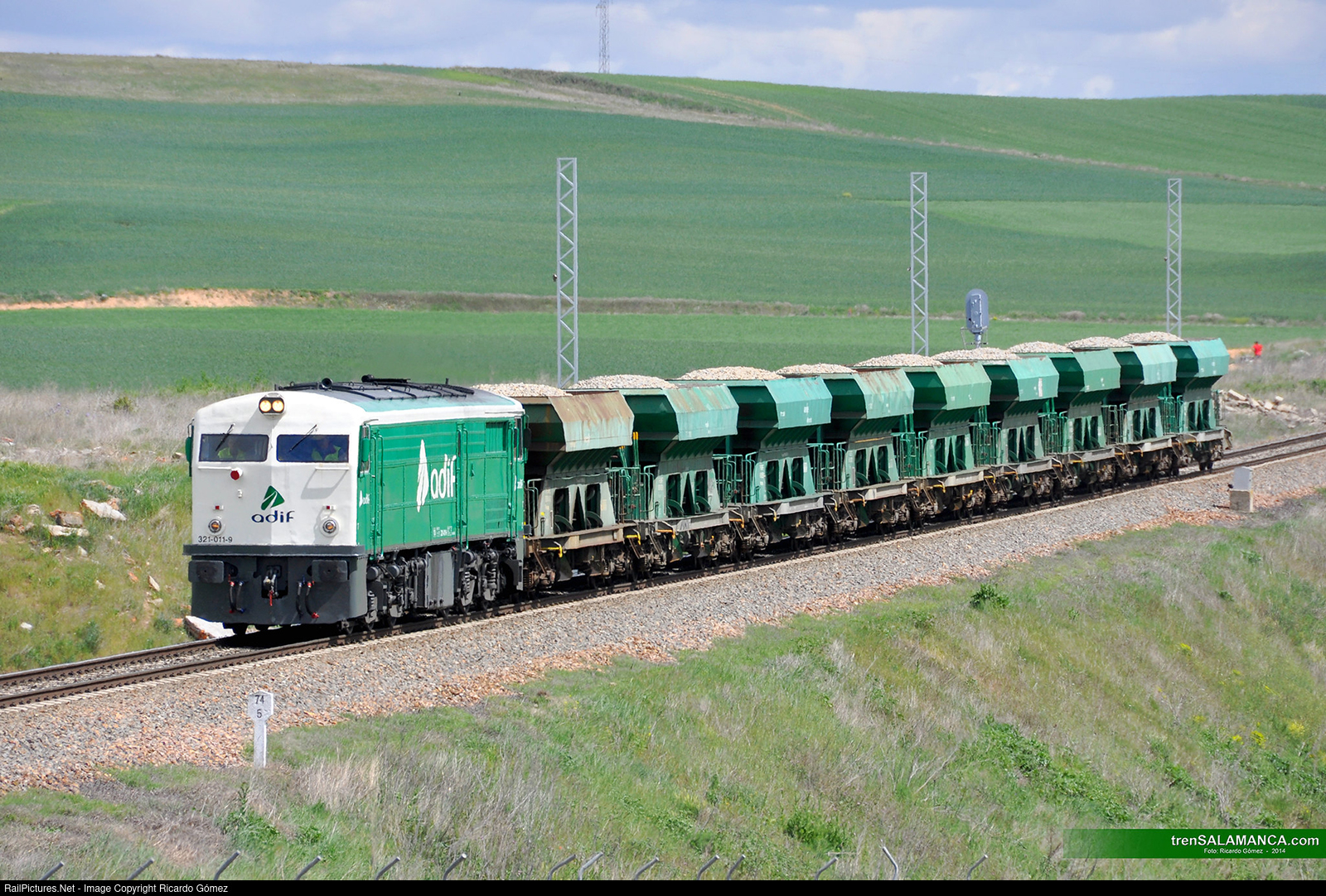 La 321-011 de ADIF próxima a Salamanca con una carga de 9 tolvas cargadas de balasto. Abril 2014