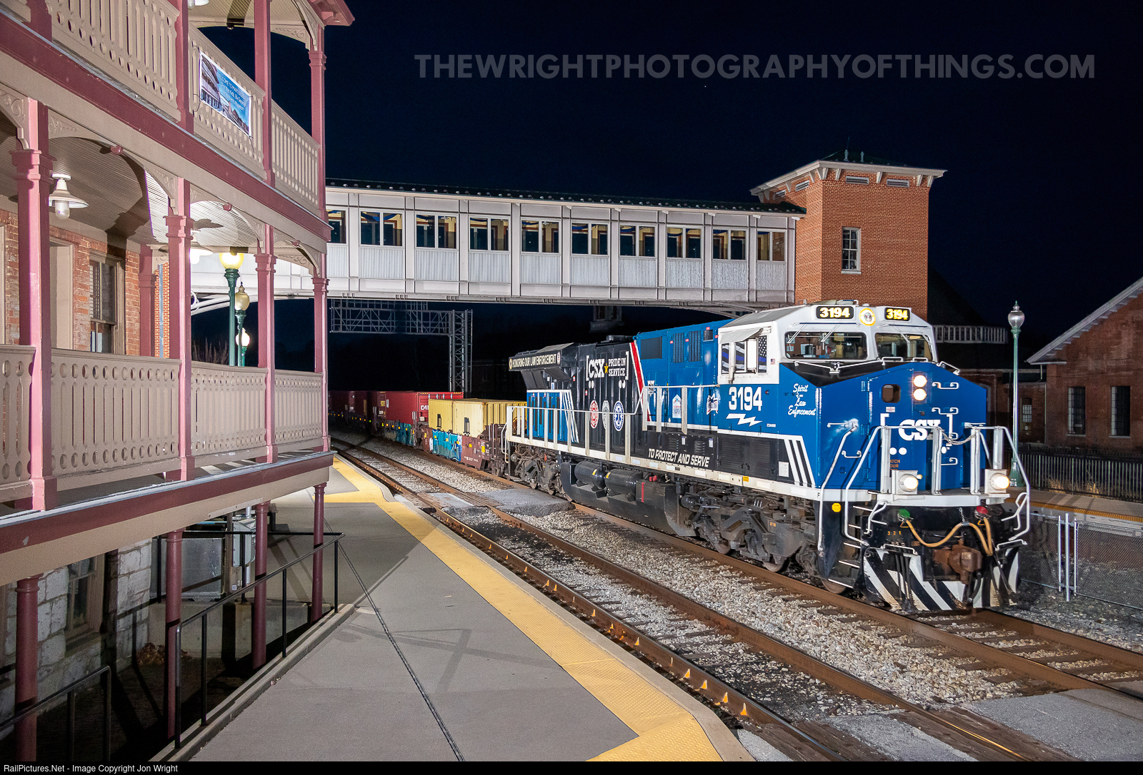 | Leading I136 through the Martinsburg Station and historic B&O Roundhouse Complex on February 21, 2022 is CSX ES44AC #3194. The engine, painted as the "Spirit of Law Enforcement" in 2019 is one of 3 units painted by CSX in their "Pride in Service" program (1776 for US Military, 911 for First Responders). |