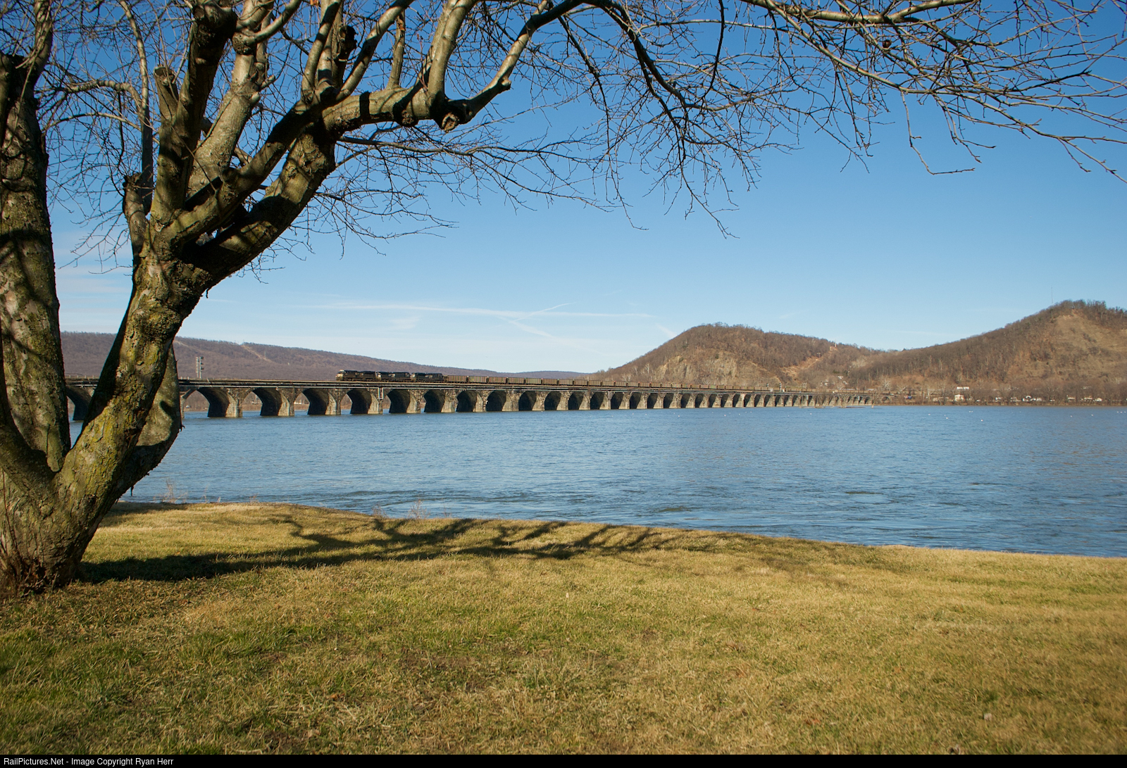 The triple seven heads west over the Rockville bridge with a long string of coal empties on the last day of February.