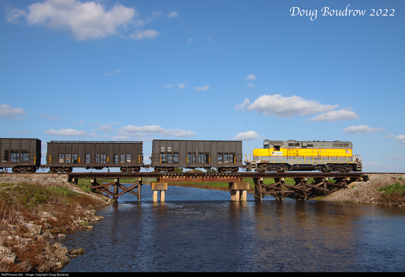 | An empty sugar cane train is seen headed East across the Miami Canal bound for a loadout not far from here. The crew was spot the empty cars on the siding and then pick up the loads to bring back to Clewiston. The GP11 locomotive was built as a GP9 for the Illinois Central in January of 1957 as IC 9214. The Miami Canal drains Lake Okeechobee all the way down to the coast at Miami, hydrating dozens of sugar fields along the way. |