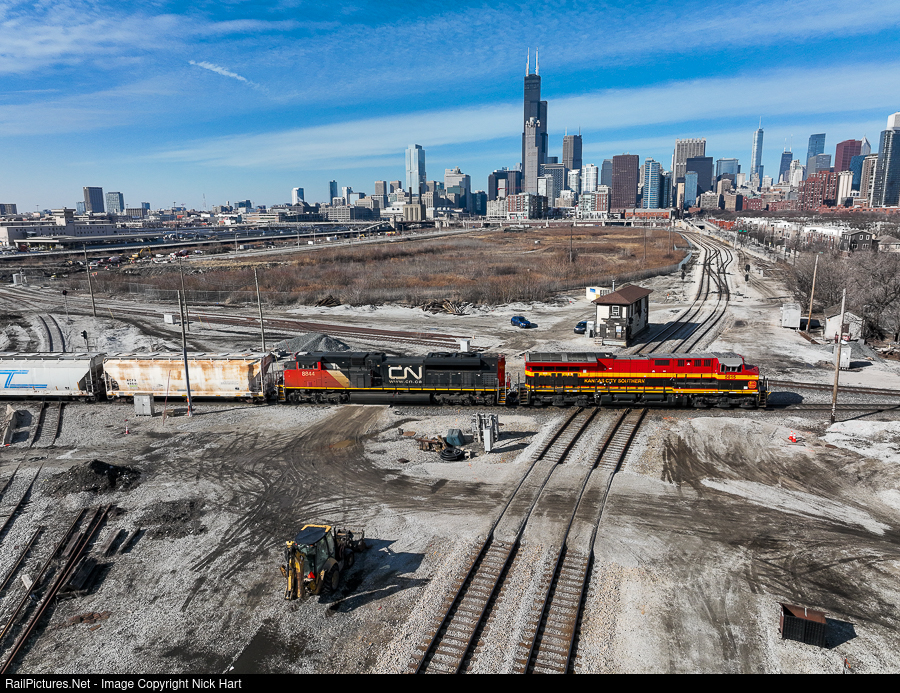 After receiving its window across 21st and 16th Street Interlockings, L536 passes the old Rock Island tower with KCS 5015 and CN 8844 providing the power.