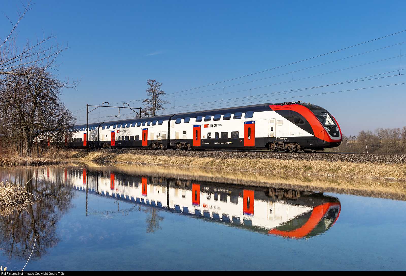 Pantograph test run of two coupled "Bombardier TWINDEXX SWISS EXPRESS" or FVD (Fernverkehrsdoppelstockzug) of the SBB on the Thurtal mainline between Sulgen and Romanshorn, passing the pond at Riedt near Erlen. RABe 502 # 216 (IR200) and RABe 502 # 406 (IR100).