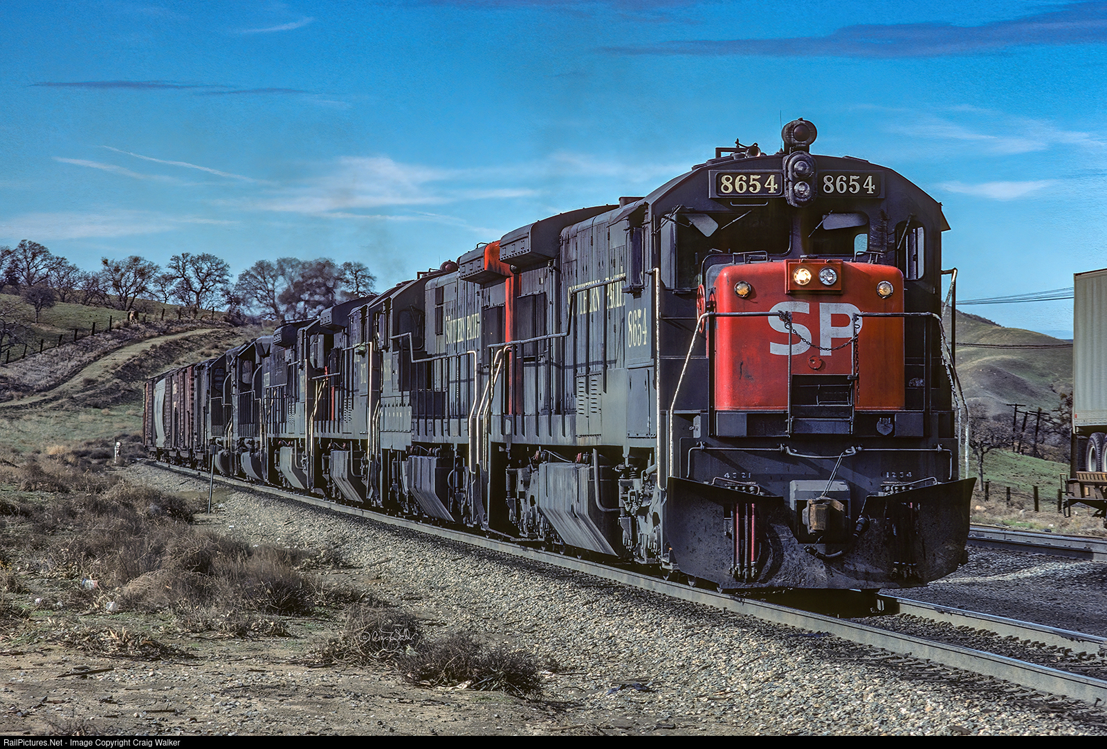 As a Southern Pacific eastbound, powered by SP U33C 8771, U33C 8635, SD45T-2 9212 and SD45 8928, stalled while climbing over the Tehachapi Mountains when one of the train’s two U33Cs failed. A westbound SP freight, heading downgrade, stopped and cut out a pair of U33Cs (8606 and 8654) to aid this disabled train, adding these engines to the eastbound’s headend to get it to the summit in the town of Tehachapi. The train made an awfully nice racket as it assaulted the grade with three U33Cs, an SD45T-2 and an SD45 - even with one of the GEs not working! (Bealville, California – January 20, 1978)