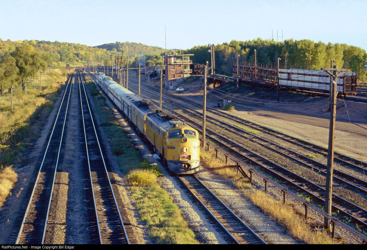 Amtrak train 17, the North Coast Hiawatha races into St. Paul past Milwaukee Road's Pigs Eye Yard hump tower and BN's main and Dayton's Bluff yard lead. E9 MILW 31C, built in April 1956, which will become Amtrak 408, leads the train.