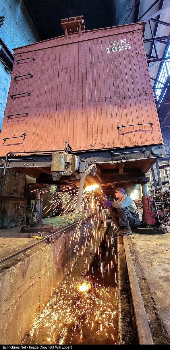 | Nick Scheresky uses an acetylene torch to cut off a bolt on the frame of one of the Nevada Northern's original wood boxcars. Keeping hundred year old equipment in service is the name of the game at this unique museum. |