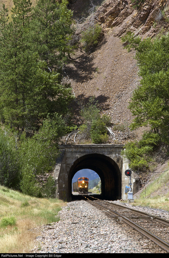 | BNSF 5735 approaches a former NP double track tunnel at Beavertail. The single tracking of this line gave enough clearance for stack trains without having to alter tunnels. The eastbound coal empties is running on MRL trackage. |