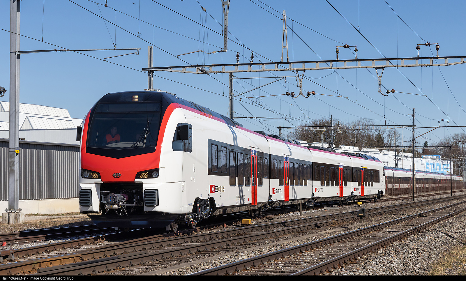 | Brand new "Mouette" Flirt RABe 523 # 504 from StadlerRail for the SBB is leaving the Erlen commissioning centre for test runs between Sulgen and Romanshorn. The SBB ordered 11 of this "Flirts" for Interregio service. |