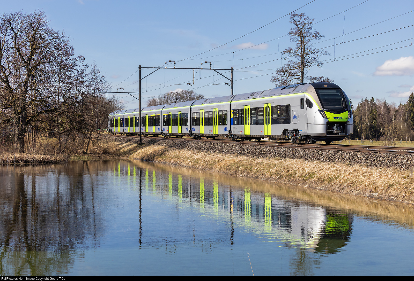 | "MIKA" RABe 528 # 202 (Flirt 4) of the BLS is on a test run from Sulgen to Romanshorn along the pond at Riedt near Erlen. This is the version for commuter services (S-Bahn) with 12 doors on each train side. The version for Regio Express services has 6 doors on each side, higher comfort in first class and 2 small "Bistros" (vending machines). The BLS ordered 30 RE (RABe 528 # 101 to # 130) and 28 S-Bahn trains (RABe 528 # 201 to # 228) from StadlerRail. They have 3500 kW, 160 km/h maximum velocity and are 105 meter long. |