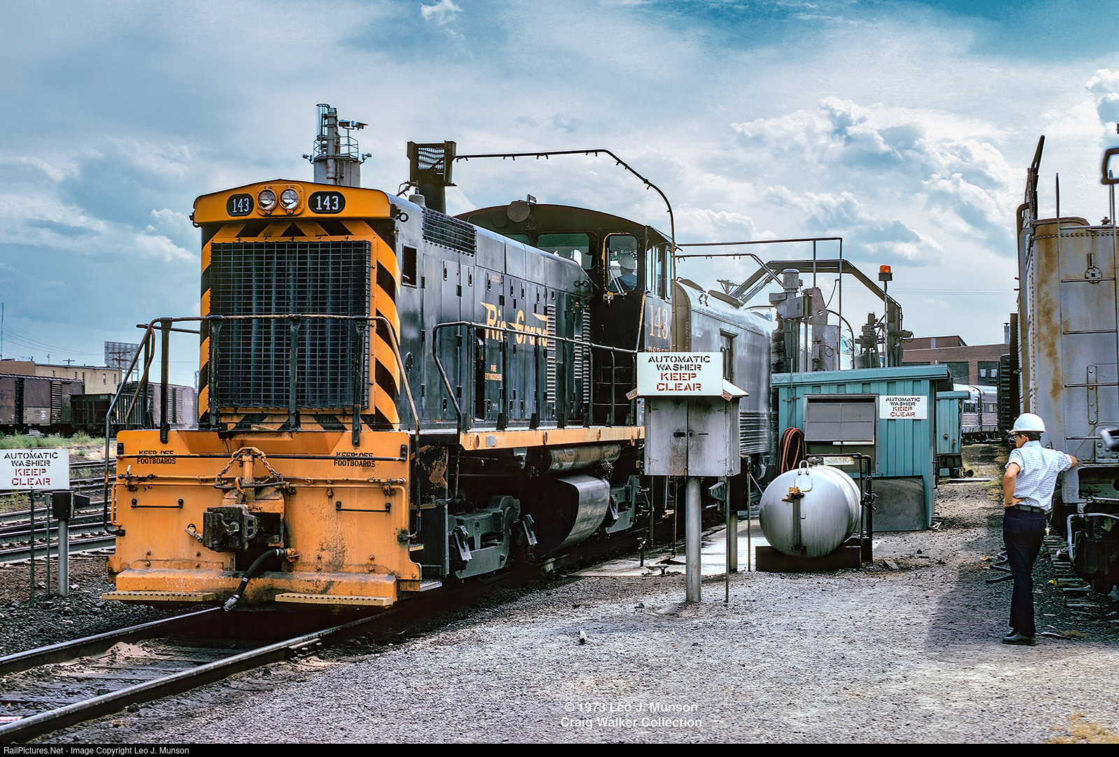 The Rio Grande Zephyr, one of the few non-Amtrak intercity passenger trains in the United States (at this time), operated six day per week, and so on the train's off day, Wednesday, the cars were washed and the diesels (D&RGW F9As and F9Bs) were serviced. On one of those Wednesdays, Denver & Rio Grande Western SW1000 143 pulled the train through the automatic washer in the railroad's Burnham Shops, while the diesels get a little TLC in the diesel shop. At this time, the train's combines (DRGW 1230 and 1231, off the railroad's long-discontinued Prospector), the first car in the train, were painted solid silver to match the rest of the old California Zephyr stainless steel cars, but as the paint was prone to excessive wear, these cars were later repainted "Grande Gold" and silver, with stainless steel fluting, to match the diesels. As the train gets washed, a Rio Grande supervisor assumes the standard manager position: Leaning on an old steam locomotive tender to simply watch the automated machinery do its thing. (Denver, Colorado – August 29, 1973). Leo J. Munson photograph, Craig Walker collection