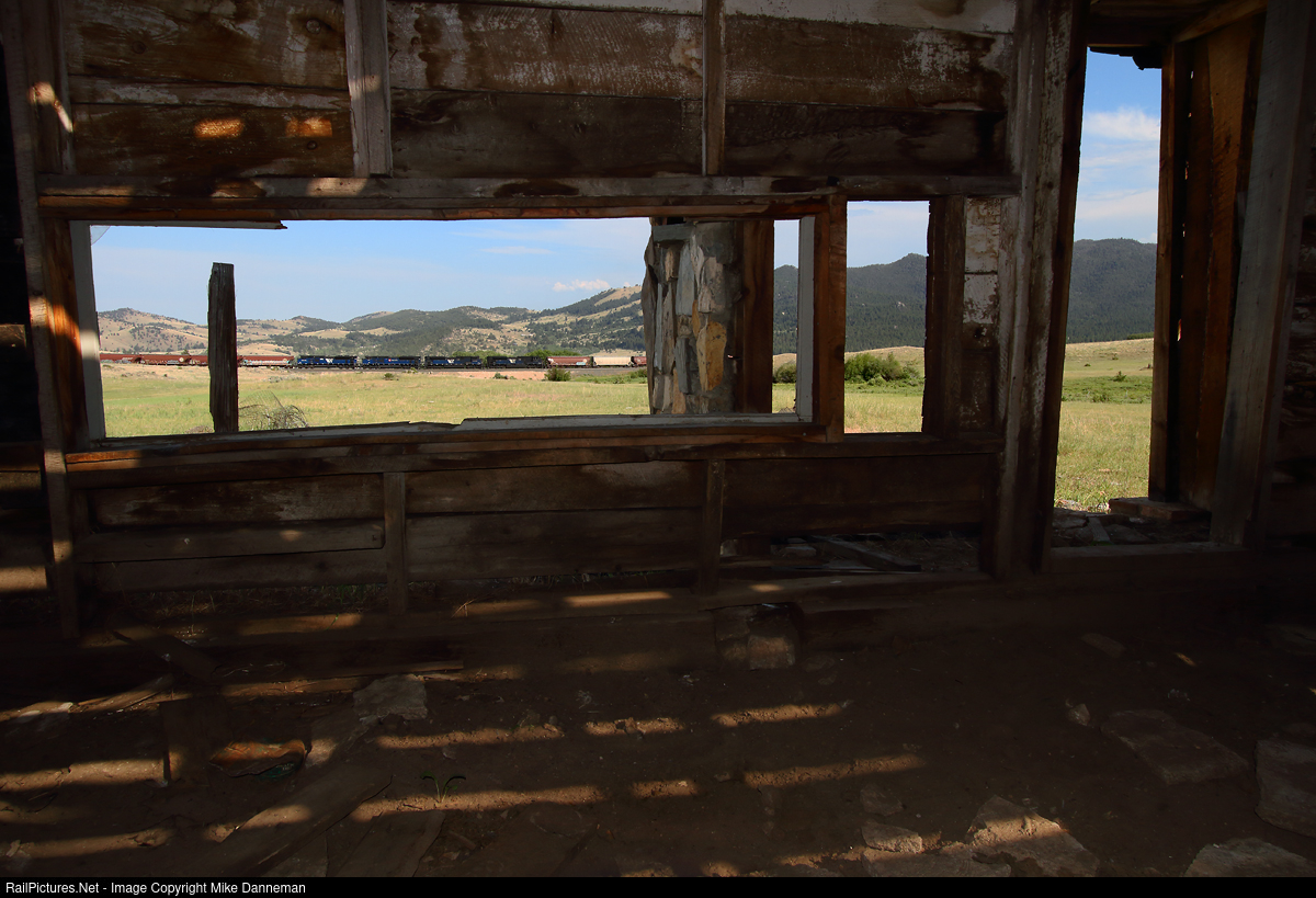 From inside a long-abandoned ranch building at Austin, Montana, is a view on a BNSF grain train slogging upgrade on Mullan Pass, assisted by a foursome of Montana Rail Link EMD SD70ACe manned helpers on the afternoon of July 5, 2021.