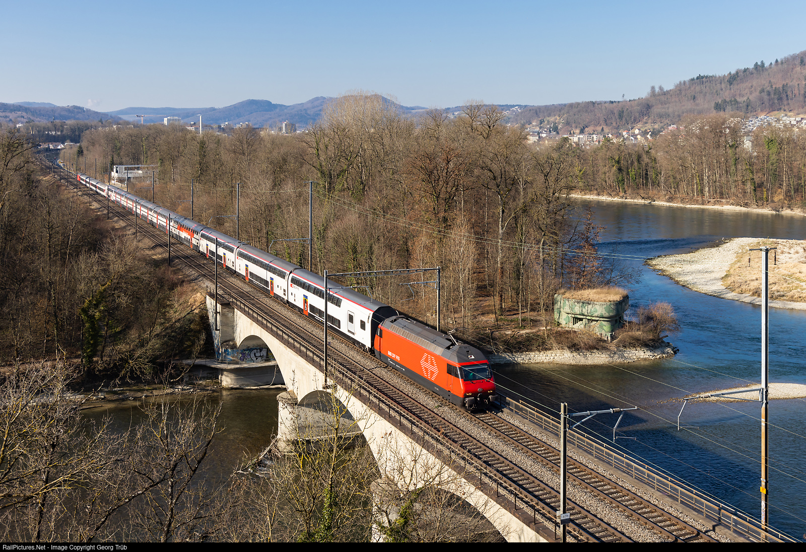 This weekend, the east-west mainline of Switzerland was completely closed in Mägenwil by planed catenary works for about 52 hours! Many trains were diverted via Brugg and Baden instead of running via Lenzburg-Heitersberg (and vice versa), others were cancelled, there were very many changed timetables and shortened or changed train runs. Train IC 10811 from Brig via Bern to Zürich only (instead of going to Romanshorn) is crossing the 93 meter long bridge over the Reuss river between Brugg AG and Turgi. This is the second oldest railway bridge of Switzerland which is still used, and was opened in 1856 by the Nordostbahn (NOB). The IC 10811, rerouted via Wildegg-Brugg-Baden instead of the Heitersberg line, is pulled by Re 460 028, followed by 9 doubledeck IC2000/IC2020 cars (push-pull train), then as reinforcement 4 standard cars type IV and in the far rear the Re 460 # 038.