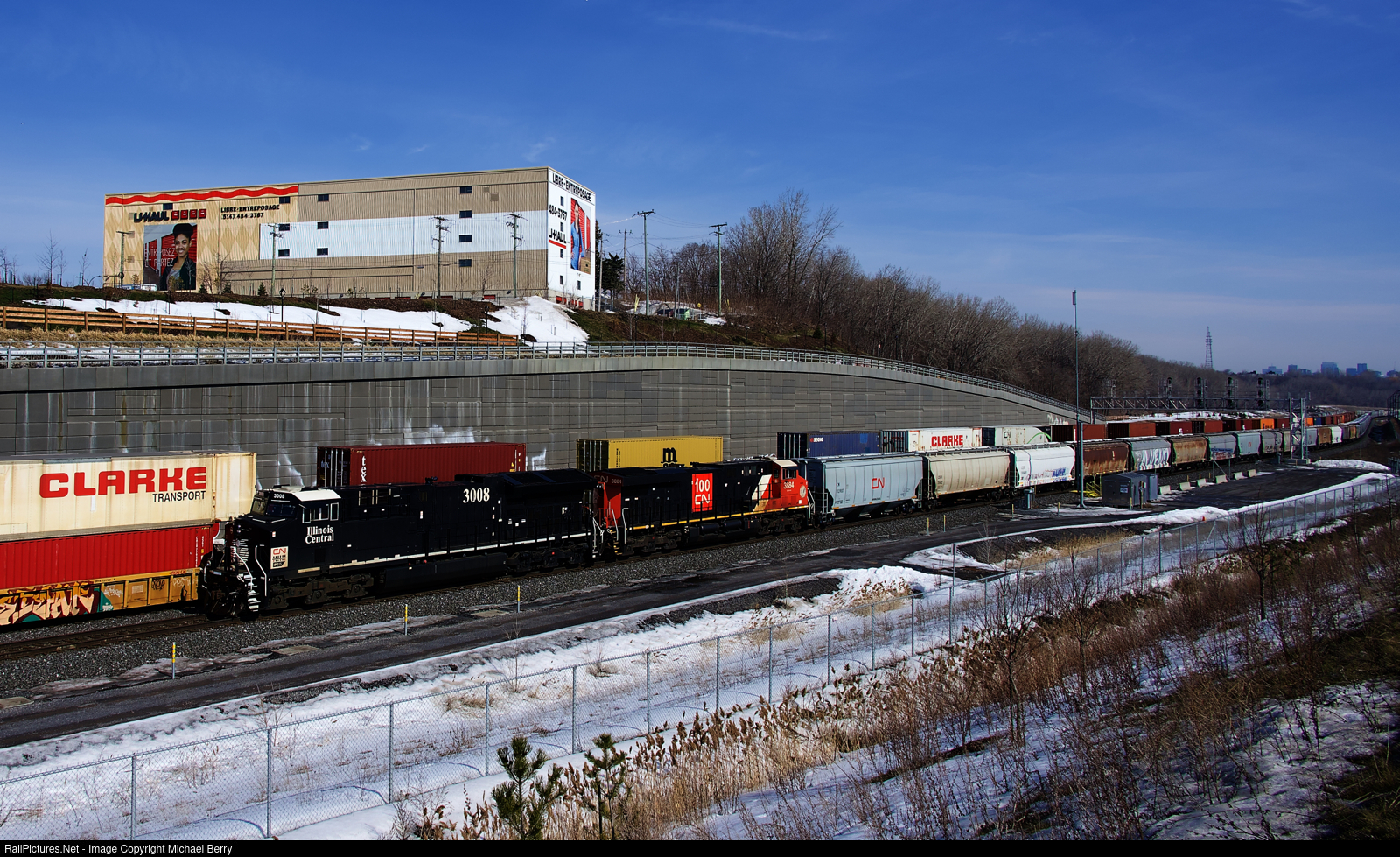 | Heritage unit CN 3008 and CN 100 unit CN 3884 are the power on empty grain train CN 875, which has just departed Turcot Ouest after getting recrewed. Behind it CN 120 heads east. |